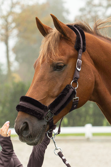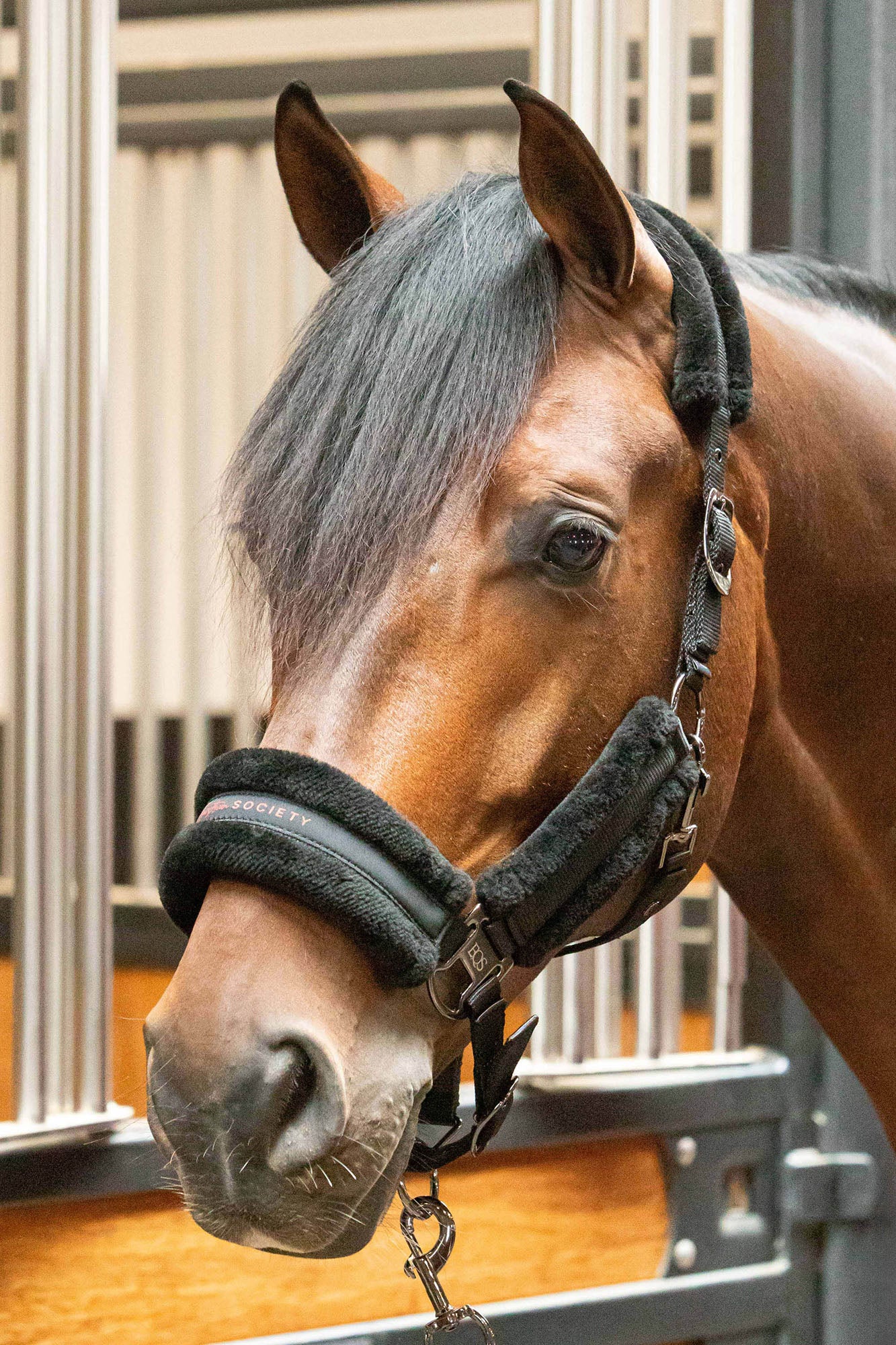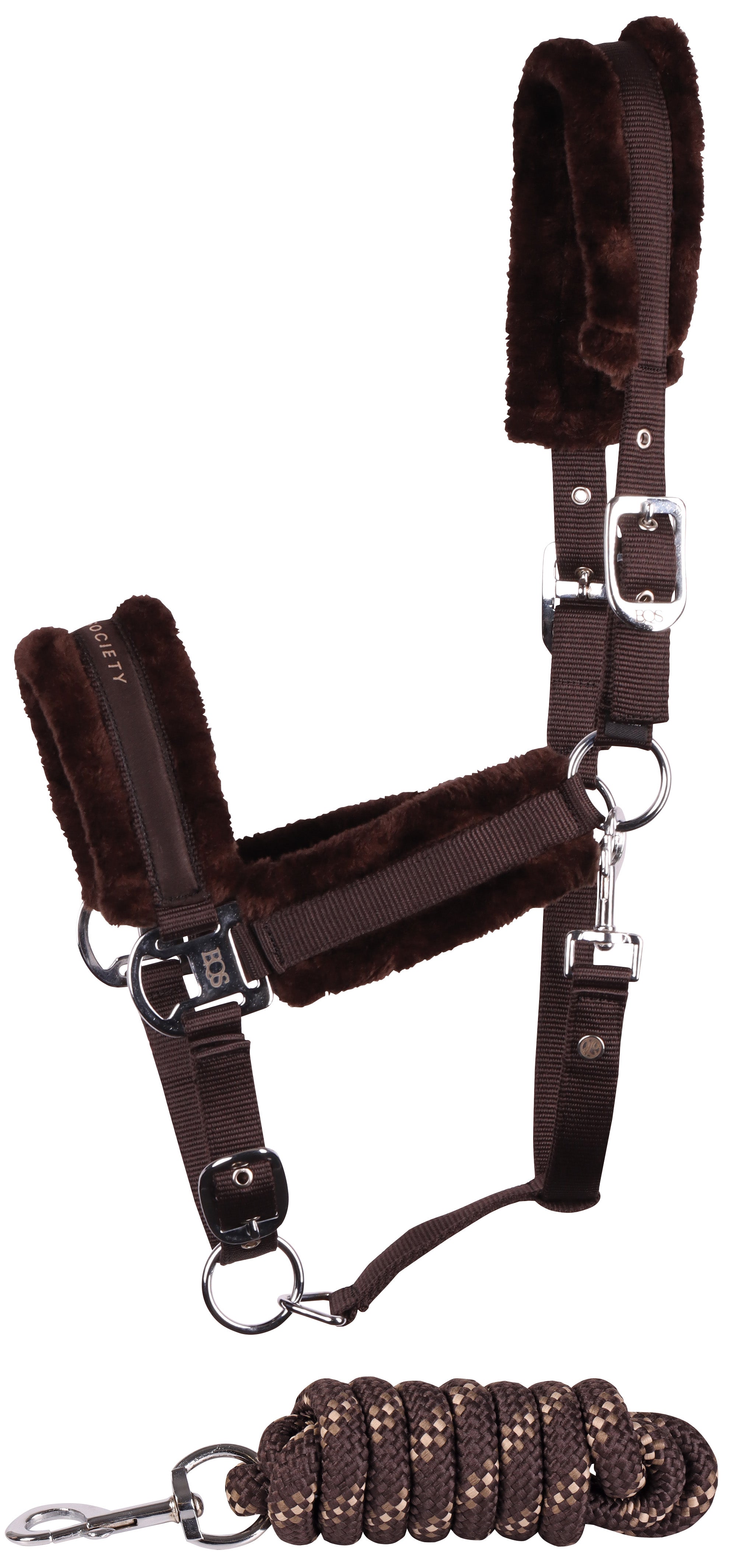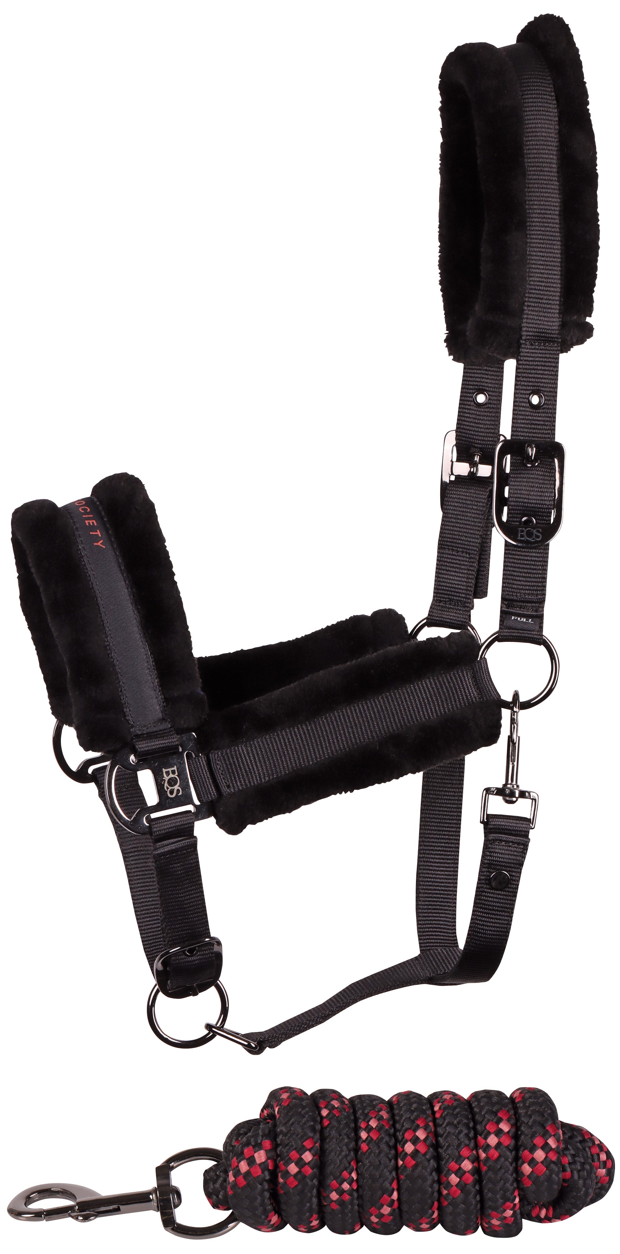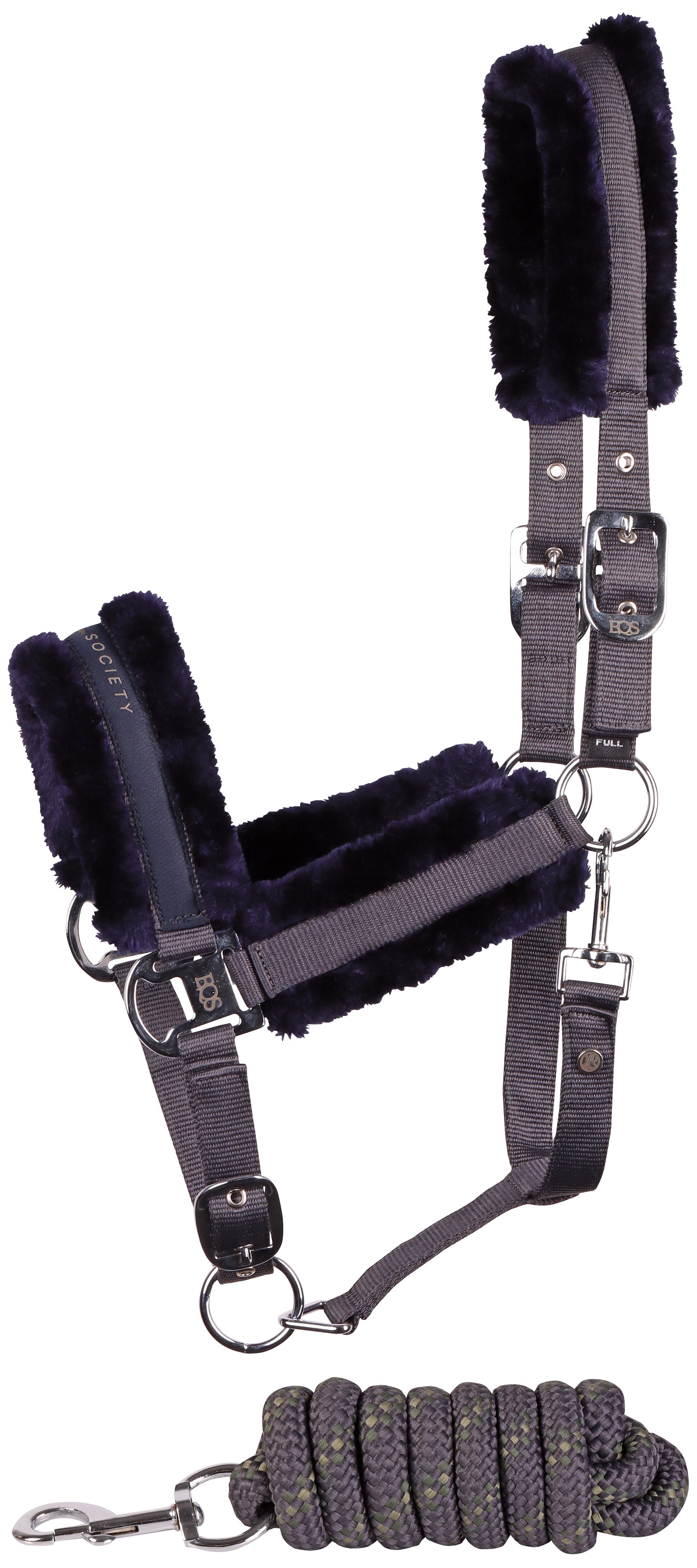 Halfterset mit Logo der Equestrian Society auf der Nase, gefüttert mit weichem Kunstfell, beidseitig am Kopfstück und an der Nase verstellbar, inklusive eines 2 Meter langen Halfterseils.