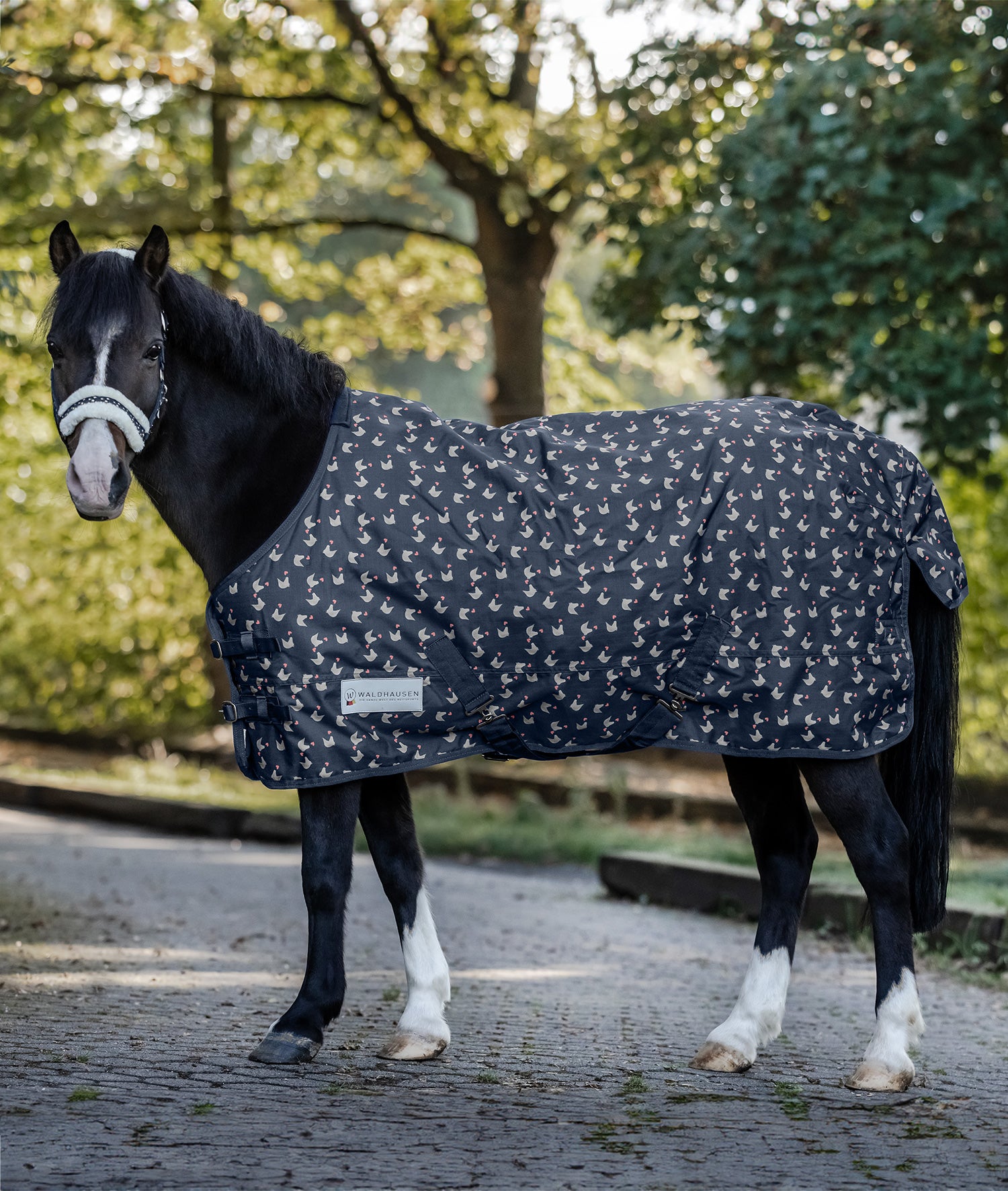Waterdichte en ademende regendeken met een schattige all-over print, in 600 denier met fleecevoering. Met dubbele borstsluiting, gekruiste banden, lussen voor beenriemen en geïntegreerde filetkoord. Past op alle artikelen uit de Waldhausen Lucky-serie.