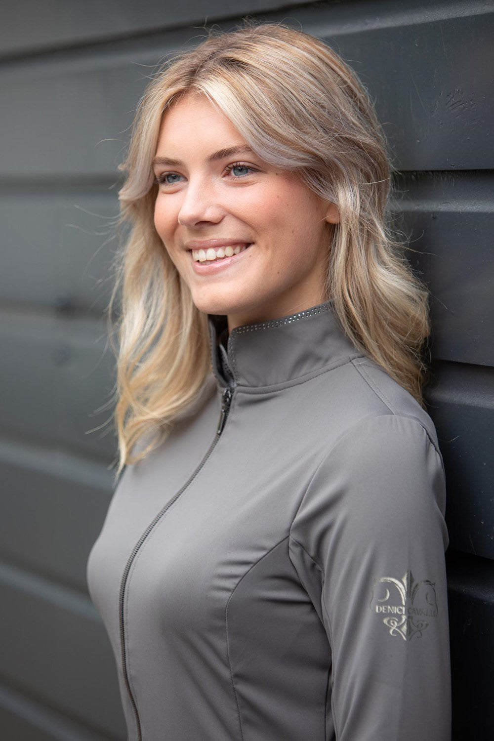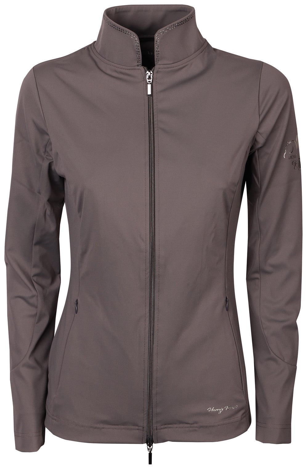 Strickjacke mit Stehkragen, verziert mit einer doppelten Reihe von Kristallen, einem Zwei-Wege-Reißverschluss, zwei seitlichen Reißverschlusstaschen und dem Denici Cavalli-Logo auf dem linken Ärmel.