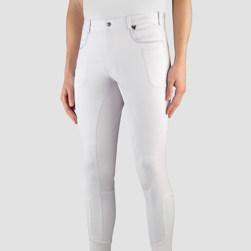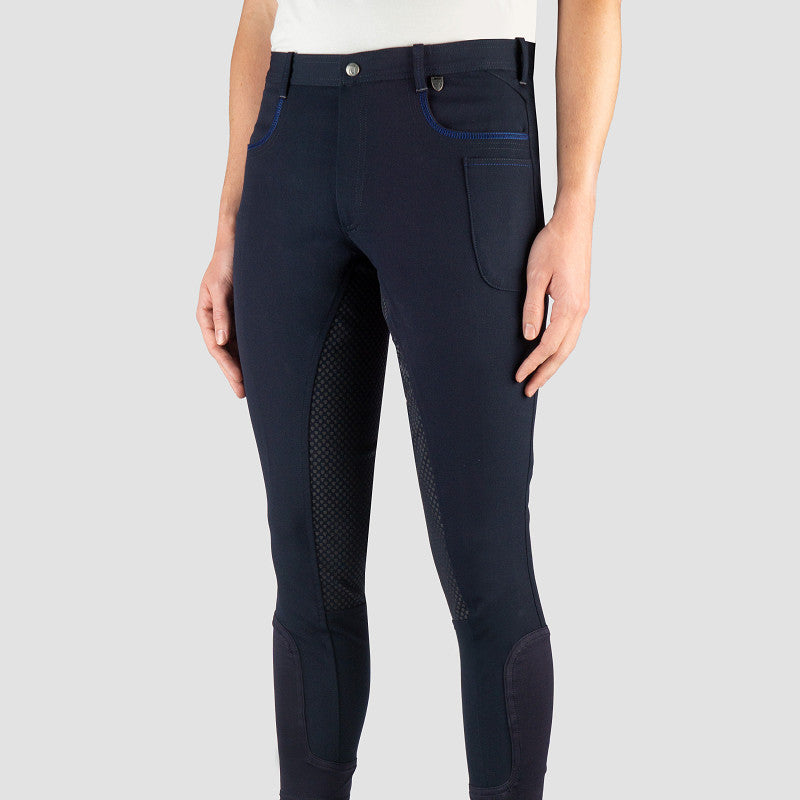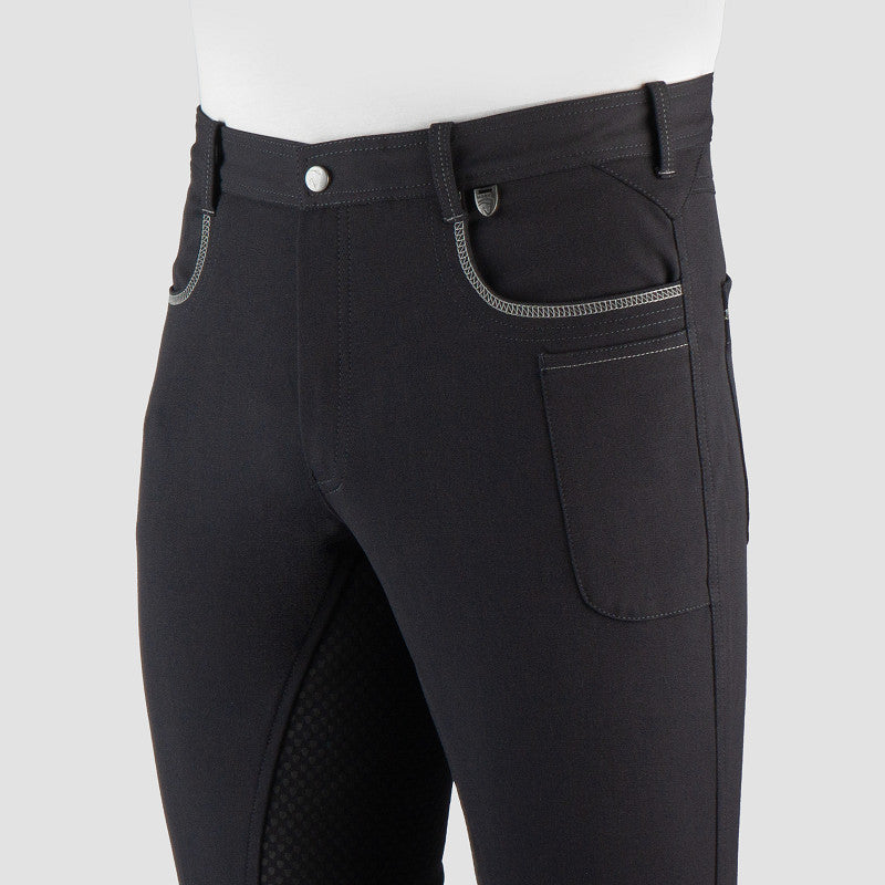 Pantalon d'équitation moderne pour homme en tissu technique. Fond en silicone pour une bonne adhérence en selle. Des détails de couleur contrastée et une poche pour téléphone complètent ce pantalon. Caractéristiques du produit : Pantalon d'équitation moderne pour homme en tissu technique. Fond en silicone mat avec doublure intérieure. Poche pour téléphone. Détails de couleur contrastée. Matière : 62 % polyester, 33 % viscose, 5 % élasthanne tissé.