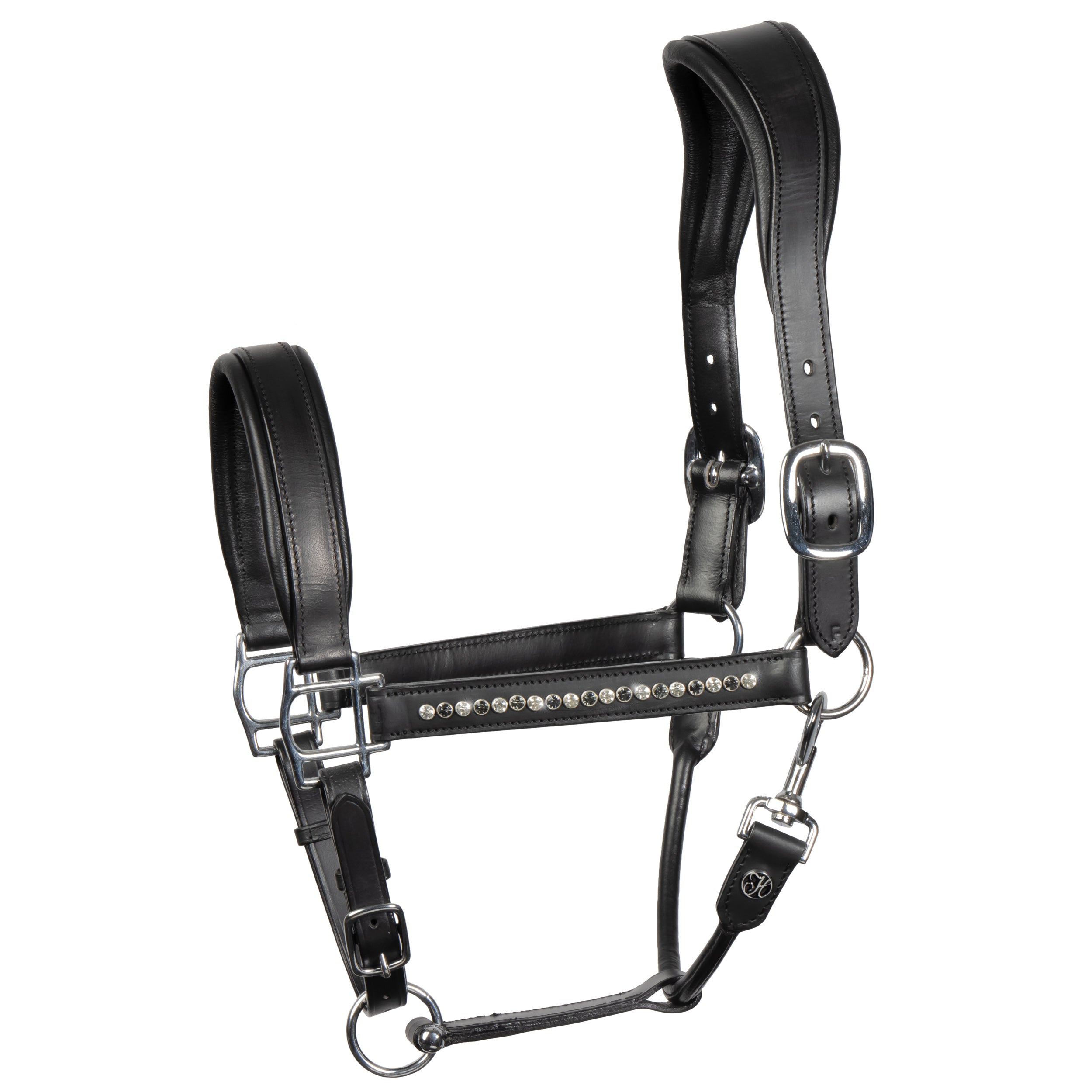 La têtière est réglable des deux côtés et au niveau de la muserolle pour un ajustement parfait. Fabriquée en cuir extra-souple et légèrement rembourrée pour un confort optimal, elle est élégamment finie avec des cristaux foncés et transparents pour une allure raffinée.