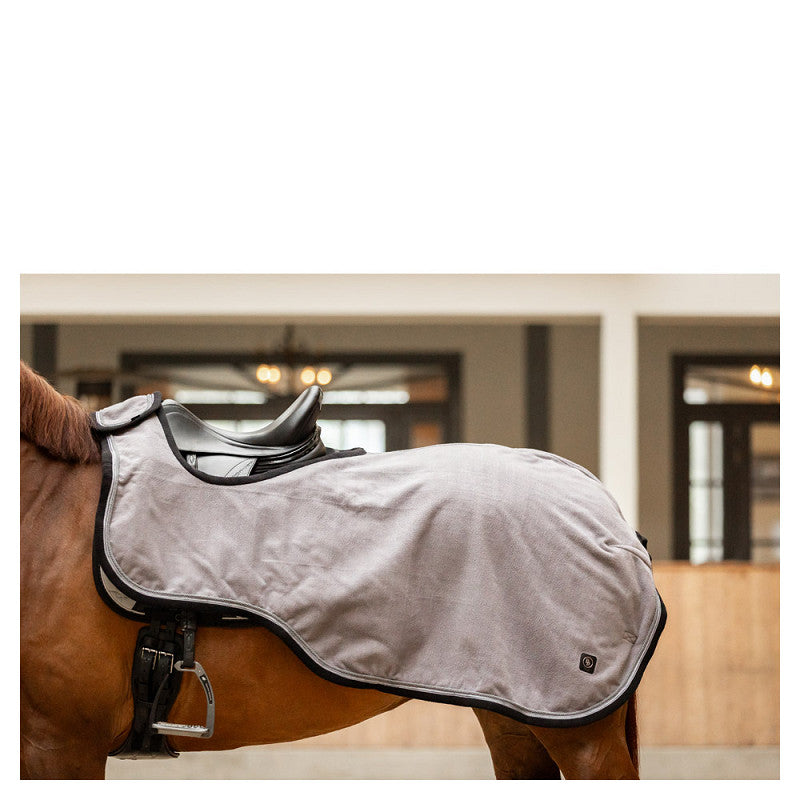 La couverture d'extérieur maintient fermement le dos du cheval grâce à sa fermeture Velcro robuste au garrot et à son cordon de queue à l'arrière. Elle est ornée d'un élégant passepoil en cordon et d'un passepoil orné du logo CLX.