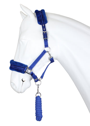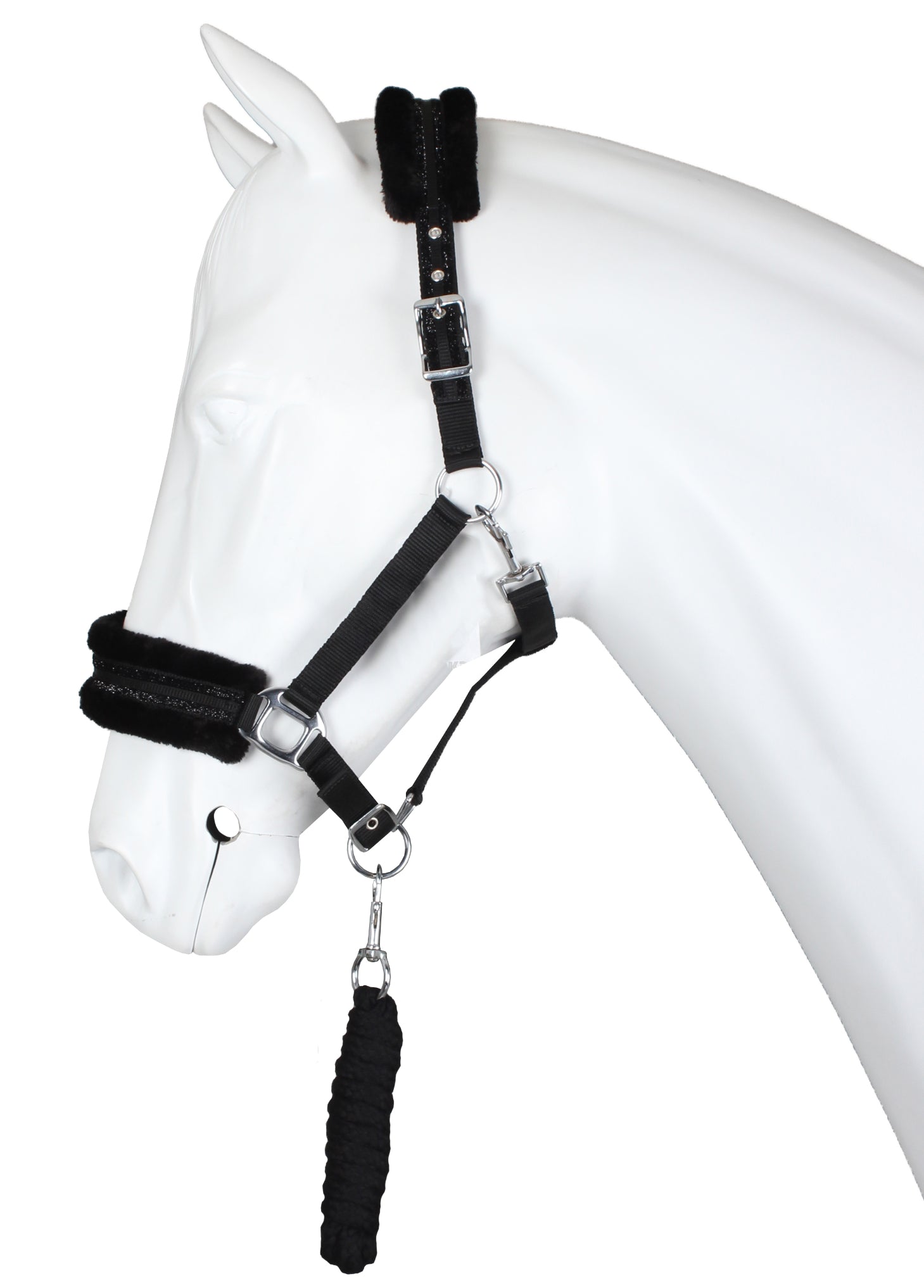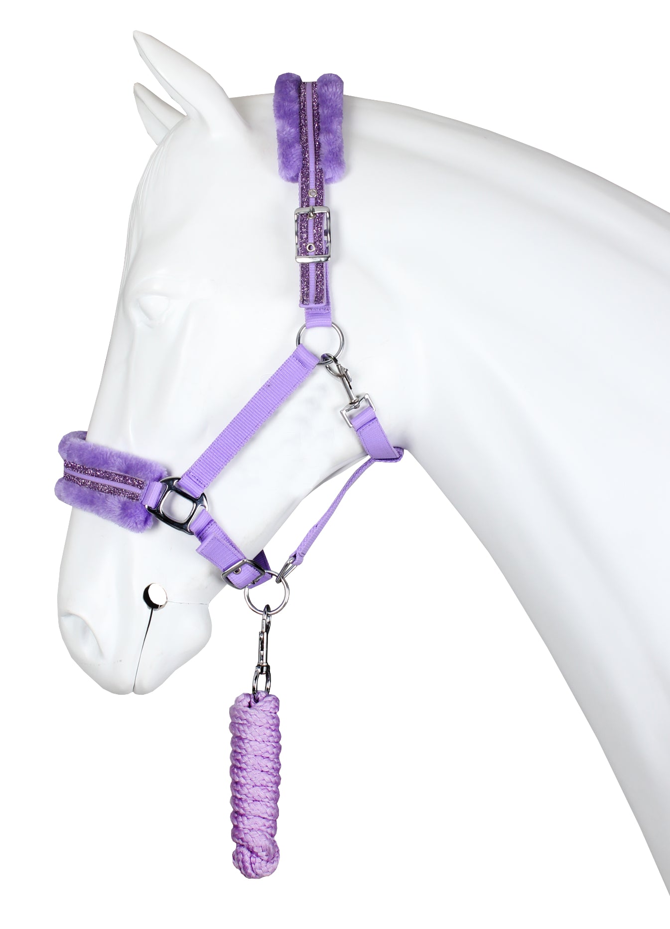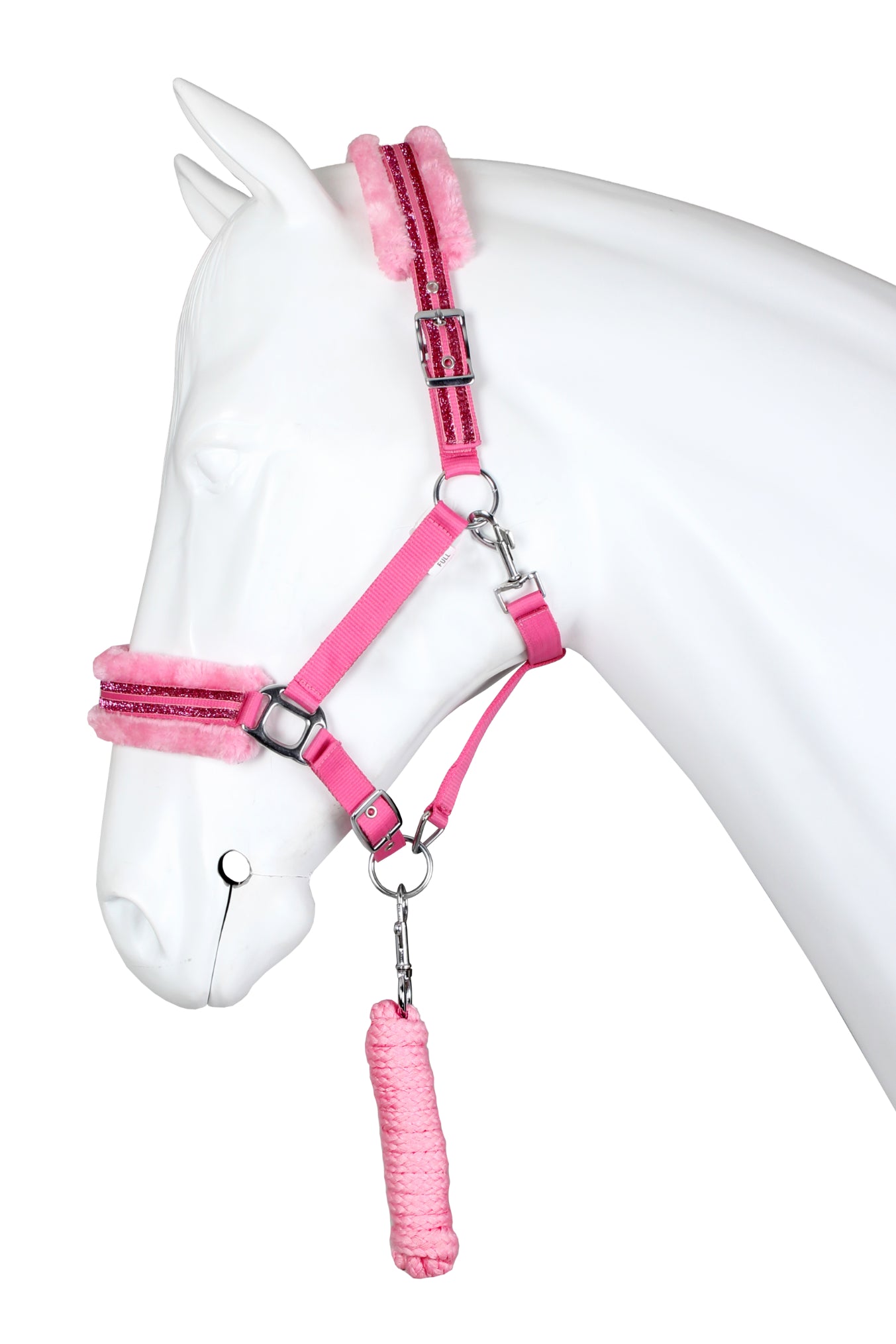 Halfterset mit weicher Teddyfleece-Polsterung und doppeltem Glitzerrand. Produktspezifikationen: PP-Halfter Kopfstück und Nasenriemen mit Teddyfleece unterlegt Doppelter Glitzerrand über Nasenriemen und Genickstück Genickstück 2-seitig mit Schnalle verstellbar Verstellbarer Nasenriemen Inkl. Halfterseil 200 cm