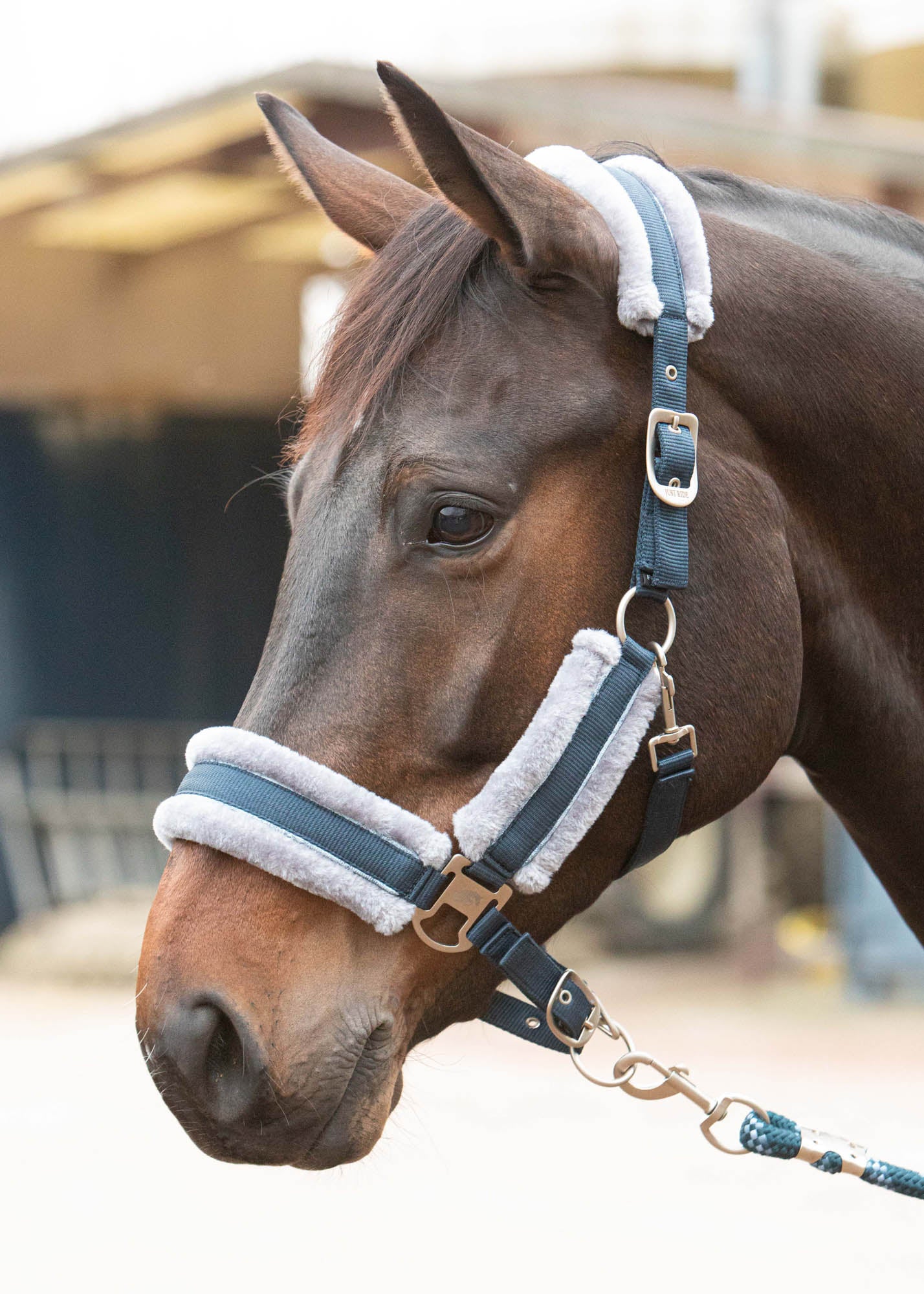 Halfter mit weichem Kunstfellfutter, kontrastierendem Material an Nase und Kiefer, doppelt verstellbar am Kopfteil und verstellbar an der Nase, inklusive 2 Meter Halfterseil.