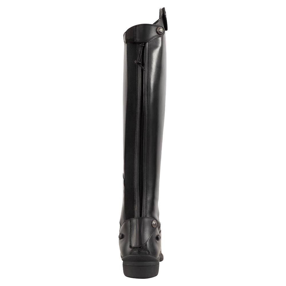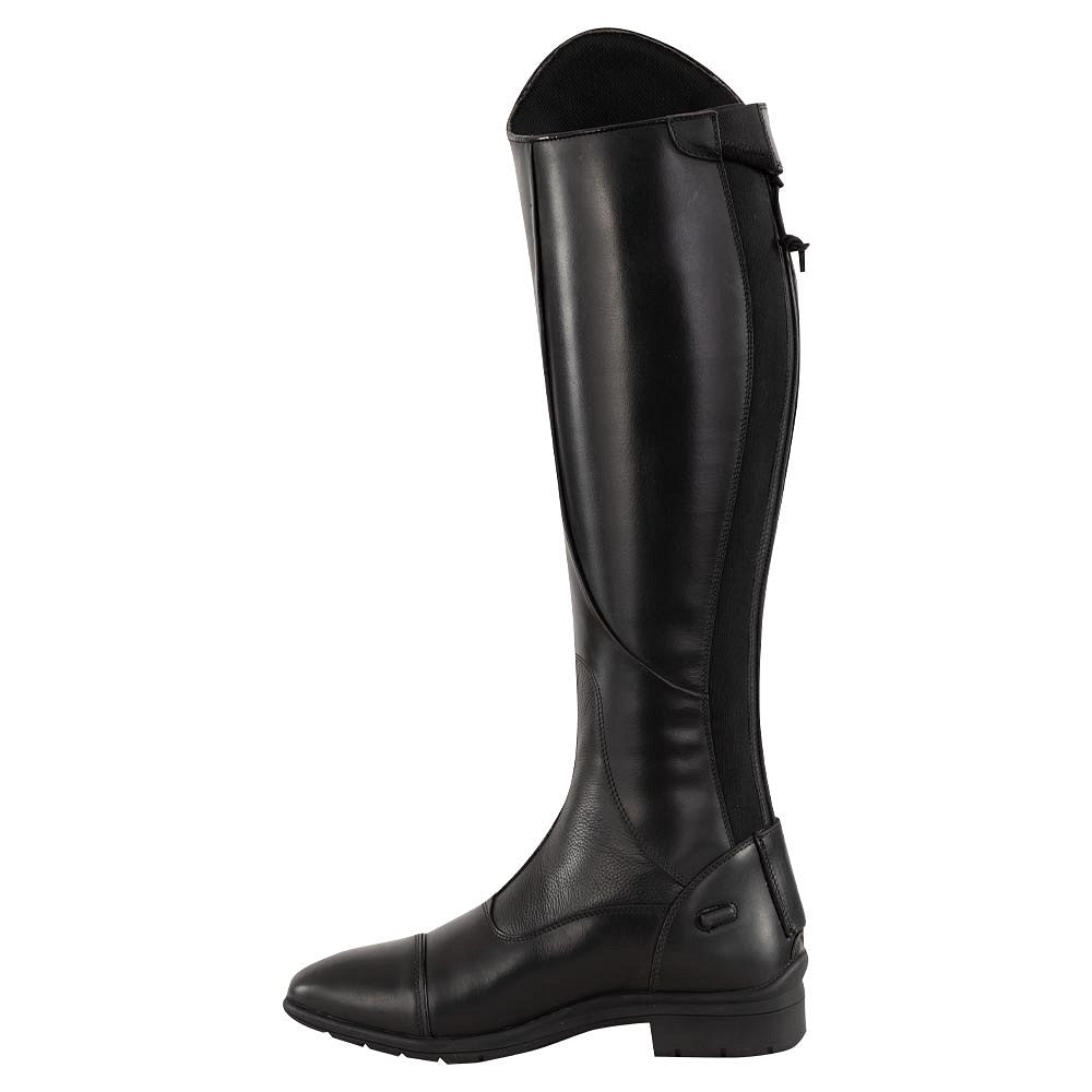 Cette botte d'équitation épouse parfaitement le pied et la jambe grâce à sa longue fermeture éclair YKK à élastique dissimulé. Un empiècement en cuir souple et extensible est placé à l'avant (en haut du cou-de-pied) pour plus de confort et de liberté de mouvement. La doublure est en cuir ciré antidérapant, et la semelle intérieure est dotée d'une finition antibactérienne pour une fraîcheur longue durée. L'embout est orné d'une subtile bordure en cuir verni. La semelle en caoutchouc à motif cranté est résistante et absorbe les chocs. Enfin, la botte est dotée de deux crampons et la fermeture éclair est munie d'une protection.