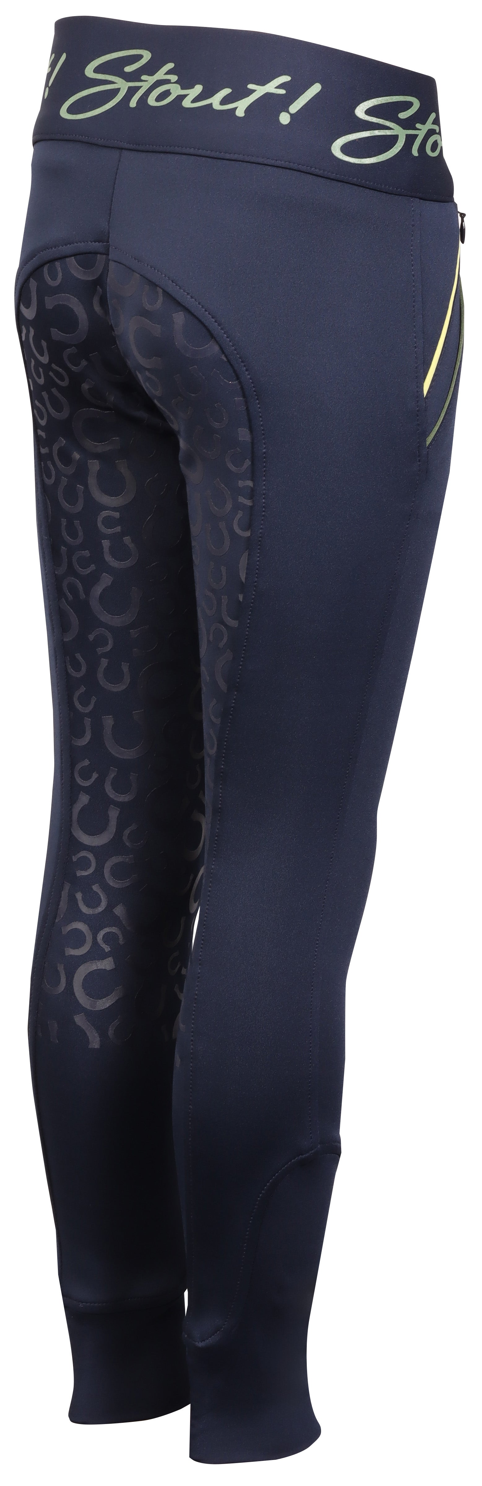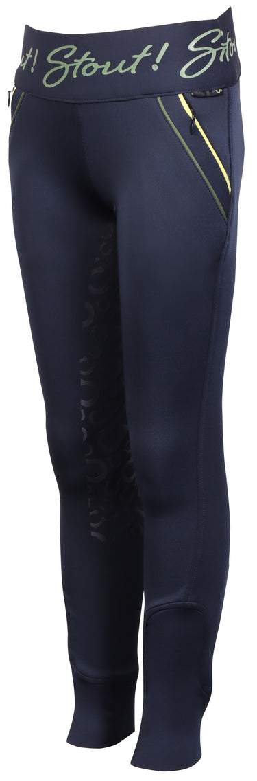Paardrijlegging met twee zakken met ritssluitingen en pipings in een contrasterende kleur, een STOUT! logo op de elastische tailleband, rondgenaaid zitvlak voorzien van een siliconen print en een elastische inzet rond de enkel voor meer comfort in je paardrijlaarzen.