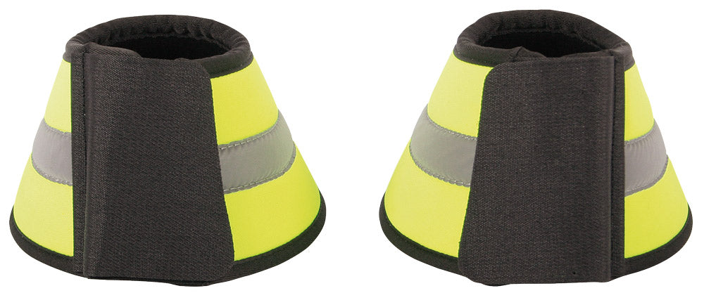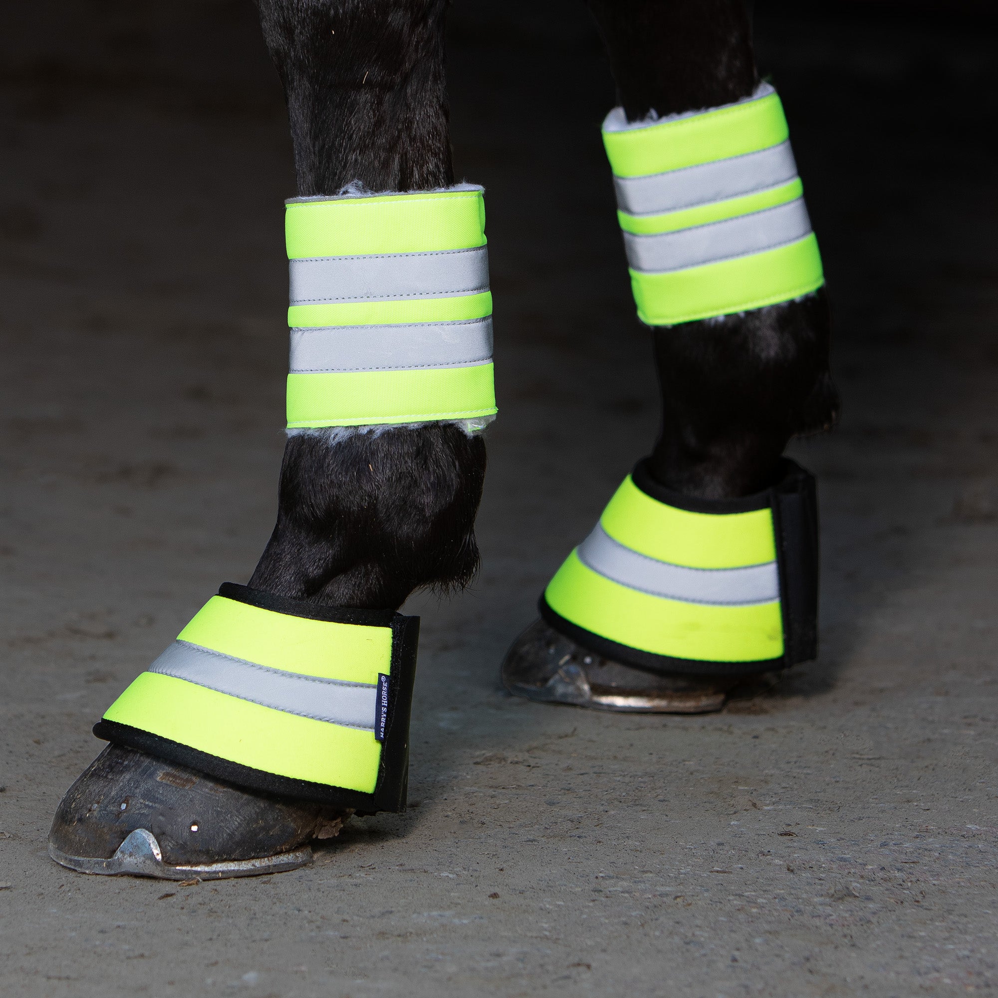 Glockengamaschen aus fluoreszierendem gelbem Stoff mit einem reflektierenden Streifen, um Ihr Pferd im Dunkeln besser sichtbar zu machen.