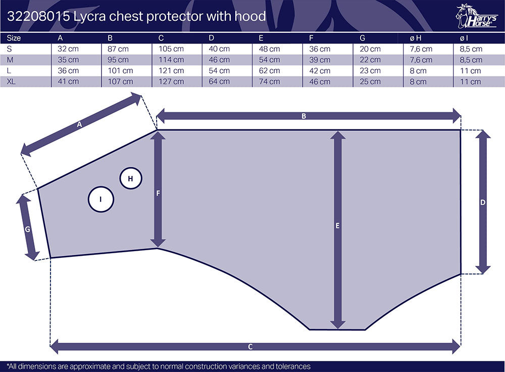 Schützt Brust, Hals und Kopf. Wird mit einem Reißverschluss unter dem Hals verschlossen. Ausgestattet mit einem elastischen Bauchgurt mit Klettverschluss.