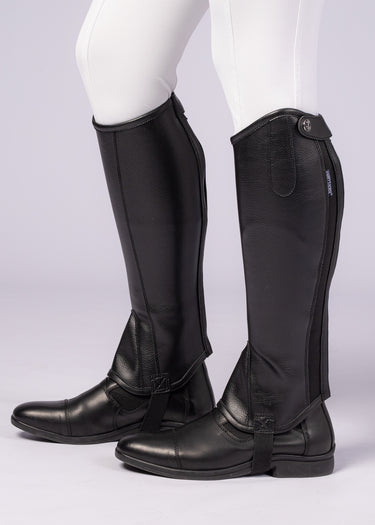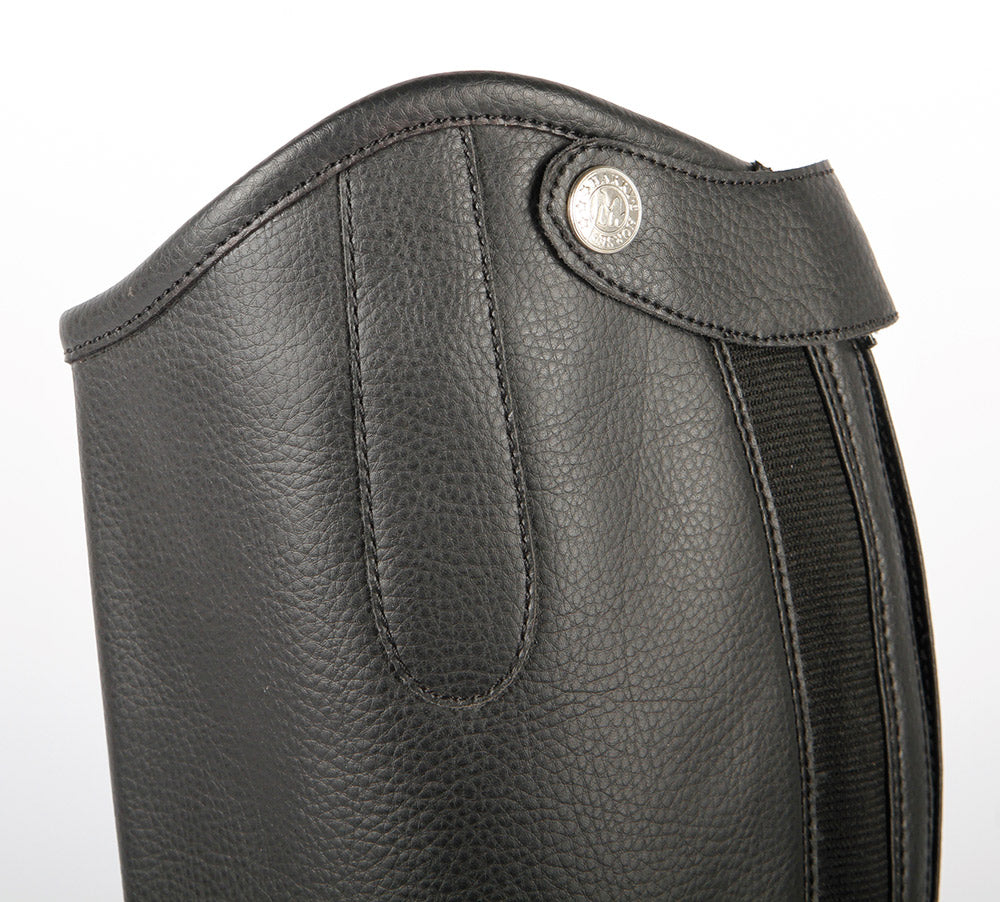 Mini-Chaps aus Kunstleder und Elastik. Elegante Passform mit Dressurschleife.