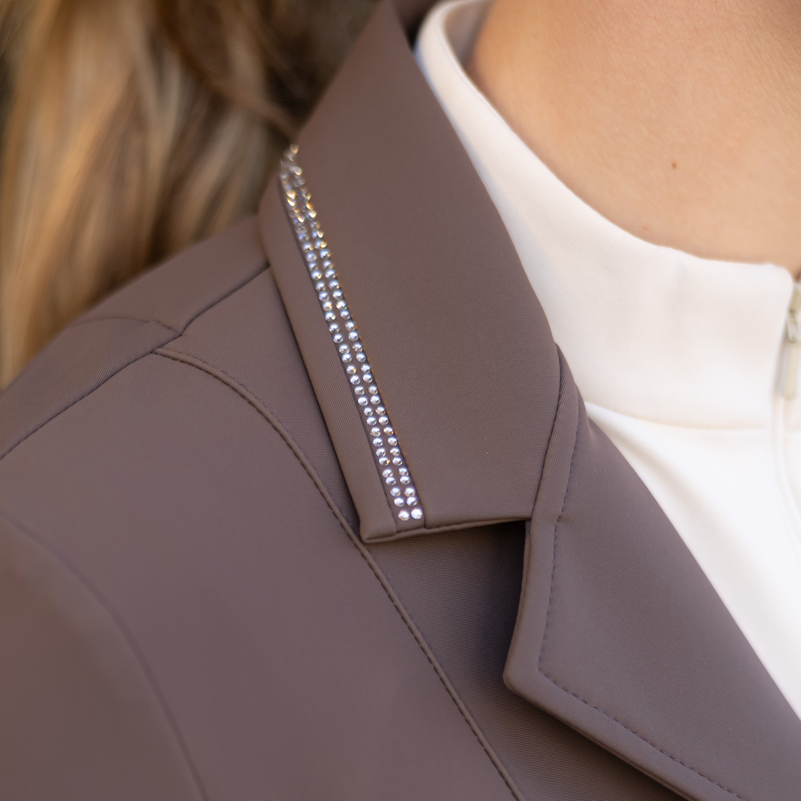 Luxuriöse Turnierjacke aus komfortablem Stretchmaterial. Die Jacke besticht durch silberne und cremefarbene Kristalle am Kragen, zwei Reißverschlusstaschen und einen Knopfverschluss mit darunterliegendem Reißverschluss für eine optimale Passform.