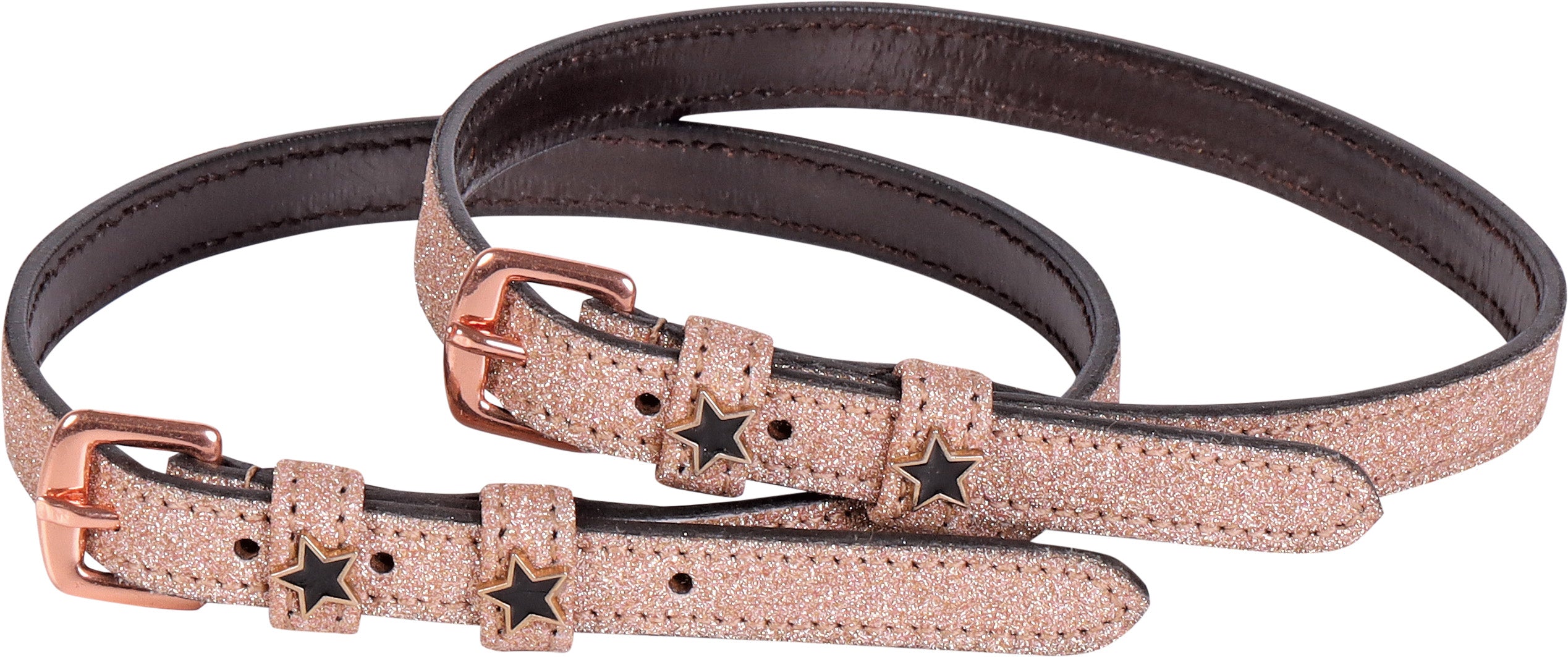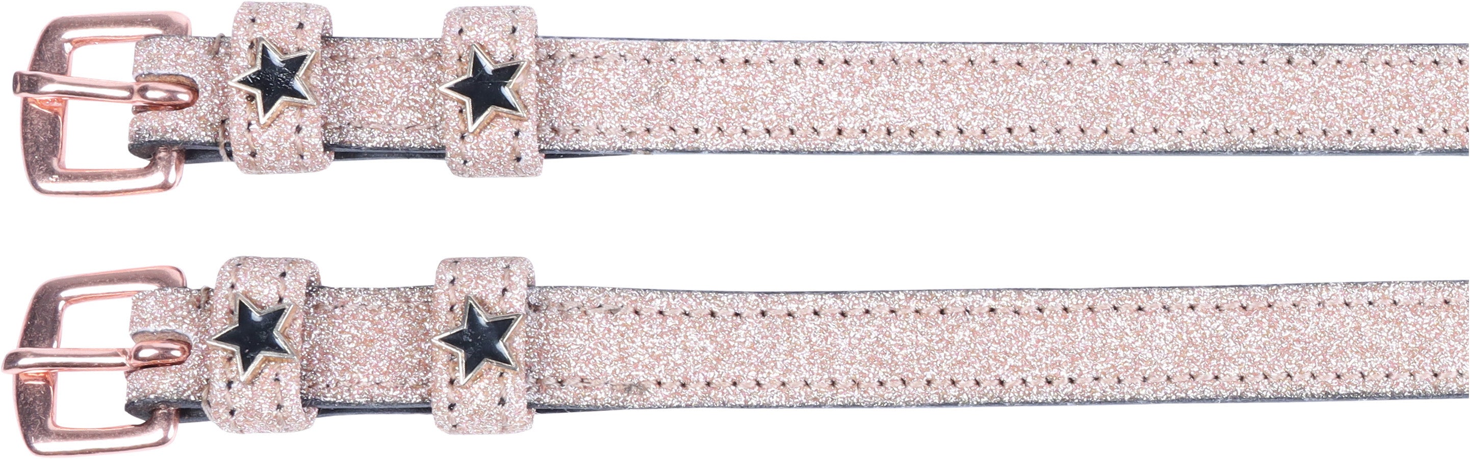 Lederriemen mit roségoldenem Glitzer. Passende Sterne an den Schlaufen. Roségoldene Schnallen.