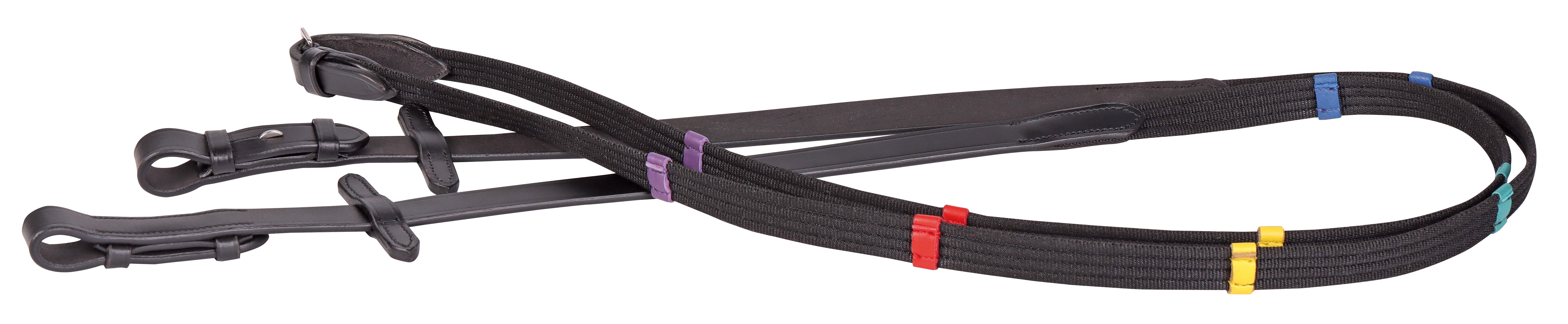 Gurtzügel mit farbigen Anschlägen zur Verbesserung der Zügelführung und als Trainingshilfe.