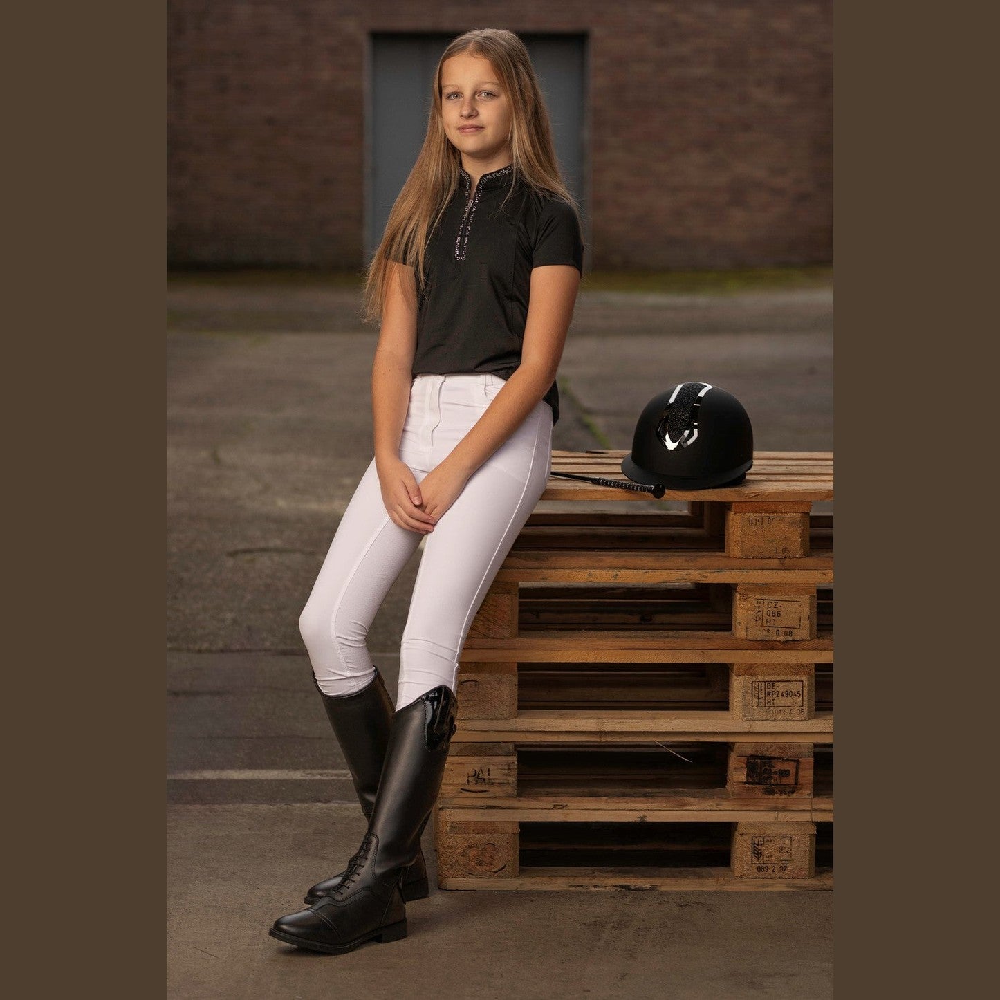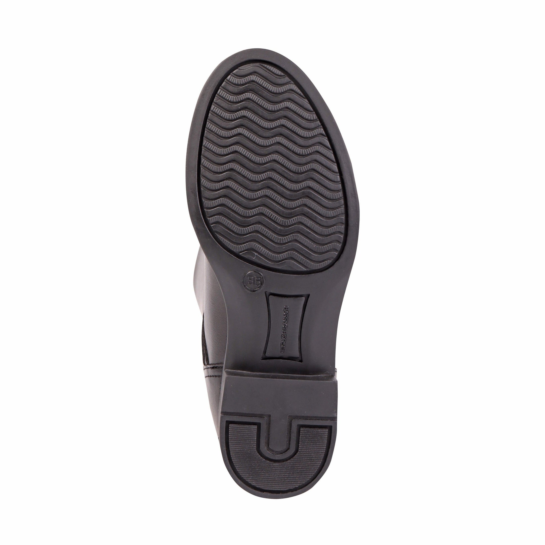 Synthetische leren rijlaars met ritssluiting aan de achterzijde. De rits is boven en onder afgedekt met een flapje met een drukknoopsluiting. Aan de voorkant een elastische veter, een elastische inzet op de kuit voor een optimale aansluiting en een lak versiering naast de knie.