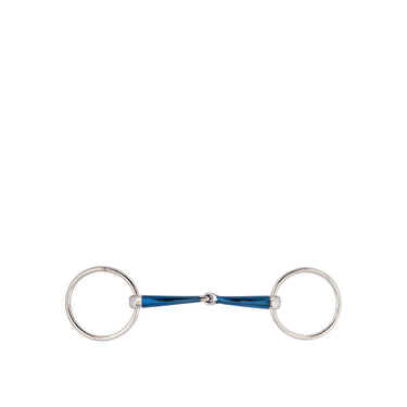 Deze enkel gebroken watertrens is vervaardigd van massief roestvrij stalen ringen en een zacht stalen mondstuk gecombineerd met een sweet iron laagje op het mondstuk (blauw). De sweet iron coating op het mondstuk stimuleert de aanmaak van speeksel. Wanneer dit materiaal reageert met vocht, warmte en lucht zal het oxideren en een zoet smakende oppervlakteroest ontwikkelen. Dit helpt bij de acceptatie van het bit. Uiteindelijk verdwijnt de blauwe kleur, maar de smaak van het oppervlakteroest blijft.