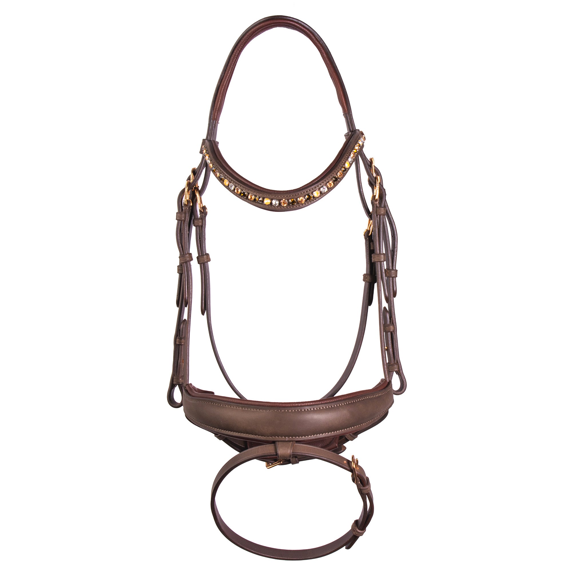 Comfortabel en zacht lederen hoofdstel, uitgerust met een anatomisch gevormd kopstuk en een bijpassende anatomische aansnoerneusriem. De frontriem is versierd met kristallen in vier verschillende kleuren en is afgewerkt met rosegoudkleurige sluitingen. Wordt geleverd inclusief teugels met blinde sluitingen.
