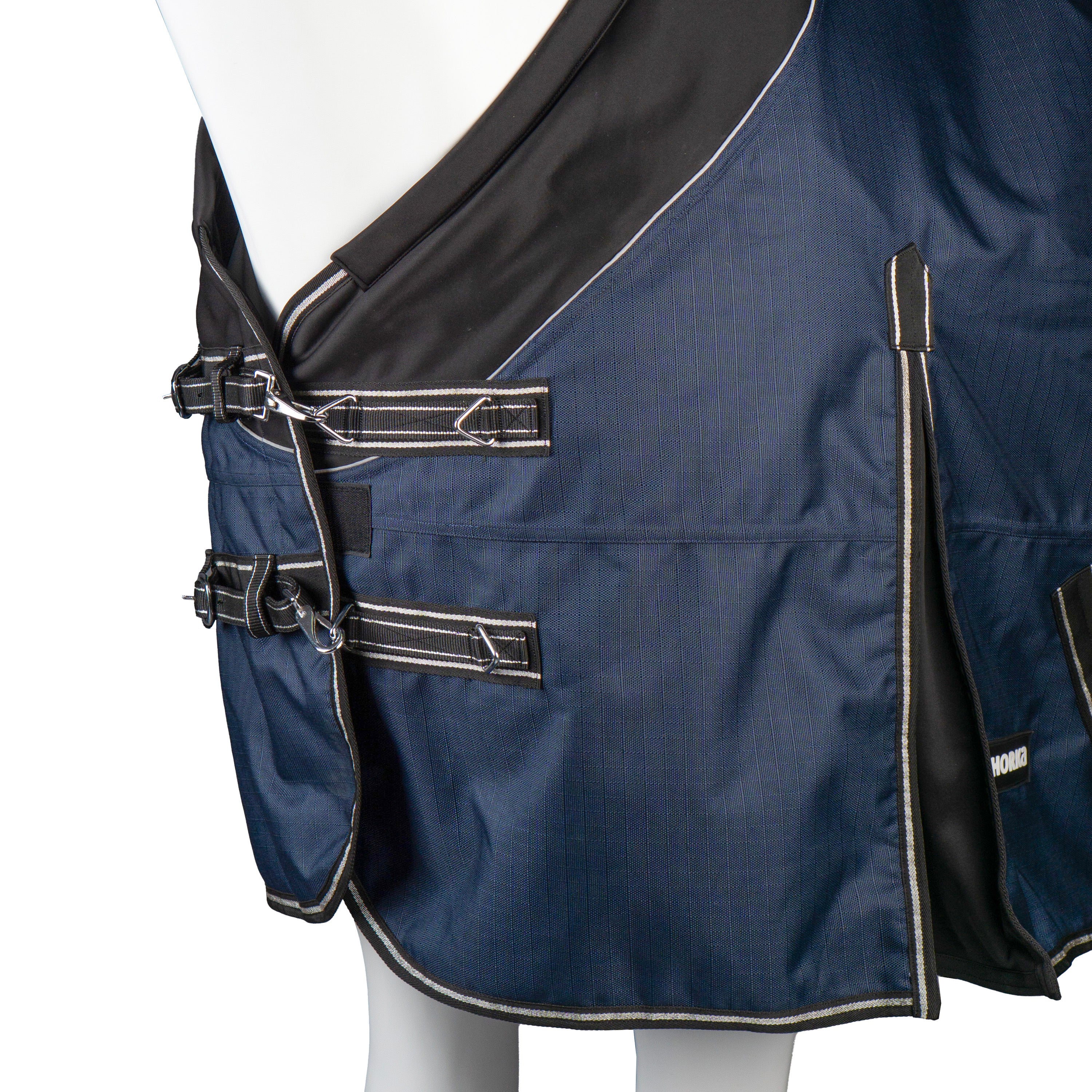 Sterke outdoordeken met zacht gevoerde softshell kraag voor extra draagcomfort. Uitgevoerd met 100 grams schoftbeschermer dubbele borstsluiting kruissingels en afneembare bilkoorden. Productspecificaties: < 1200D rip stop polyester 3000 mm waterdicht en 3000 mvp ademend 100 grams vulling polyester voering Dubbele verstelbare musketon & klittenband borstsluiting Kruissingels met elastisch uiteinde en rubberen stops Elastisch staartkoord met pvc afwerking en 2 clips Schoftbeschermer :