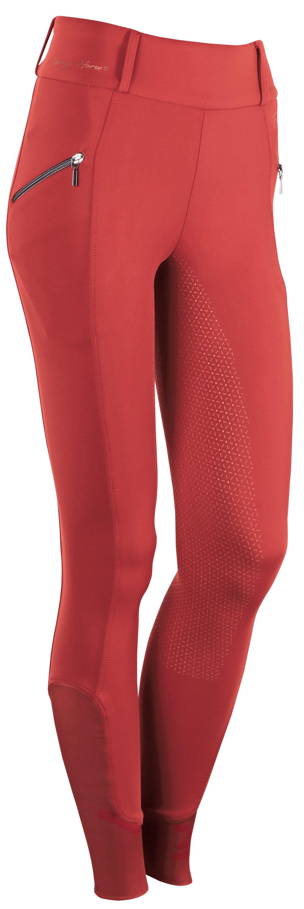 Paardrijlegging met een hoge tailleband met riemlussen waarvan een brede met kristallen op de achterkant, twee steekzakken met kristallen, zitvlak met een siliconen print voor extra grip in het zadel en een elastische inzet bij de enkels voor meer comfort in je paardrijlaarzen.