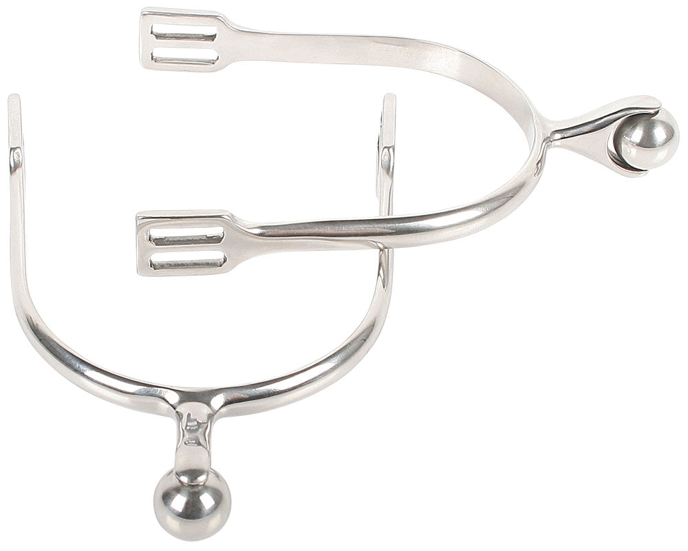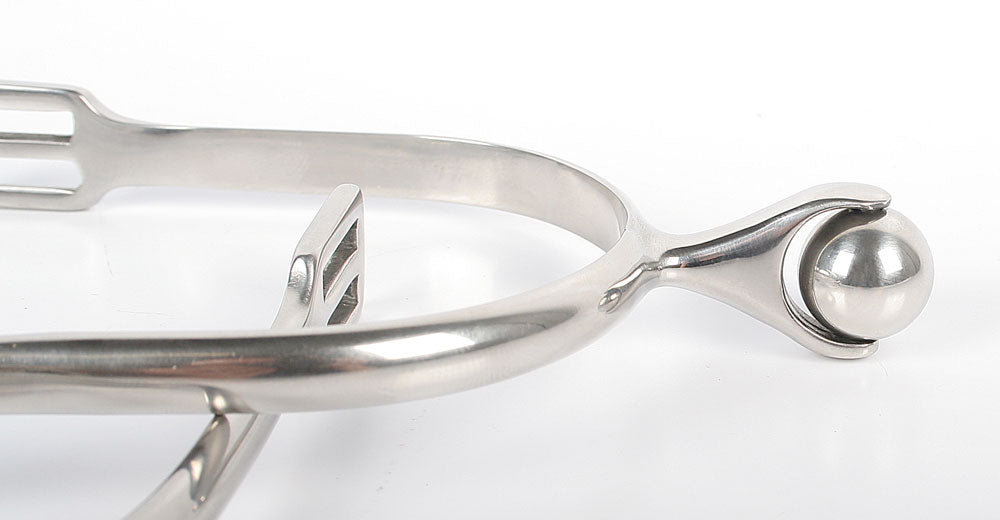 Paardvriendelijke sporen met een roterende bal van RVS. De bal draait mee tijdens het aansporen langs de huid van het paard en de hulpen worden zo op een aangename manier doorgegeven aan het paard.