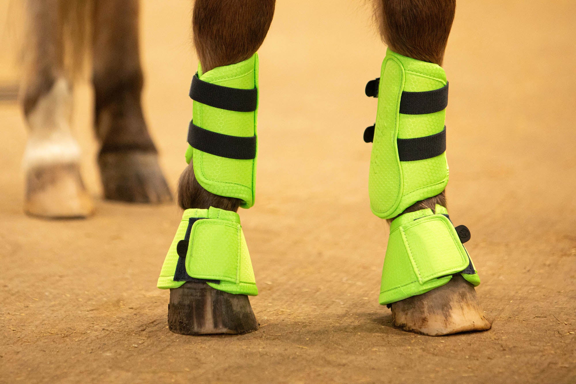 Springschoenen met een elastische klittenbandsluiting. De binnenkant is gevoerd met geperforeerd neopreen voor een optimale warmteafvoer en schokabsorbatie. De beschermers kunnen in de wasmachine op 30 graden gewassen worden.
