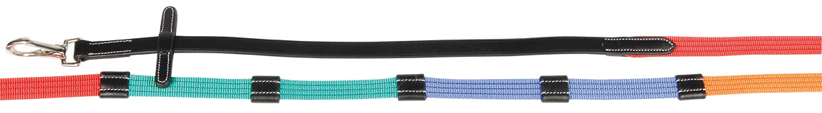 Teugels webband met lederen stops en clipsluiting voor het eenvoudig bevestigen. Uitgevoerd met drie kleuren webband (oranje/groen/rood) ten behoeve van training en het verbeteren van de teugelvoering.