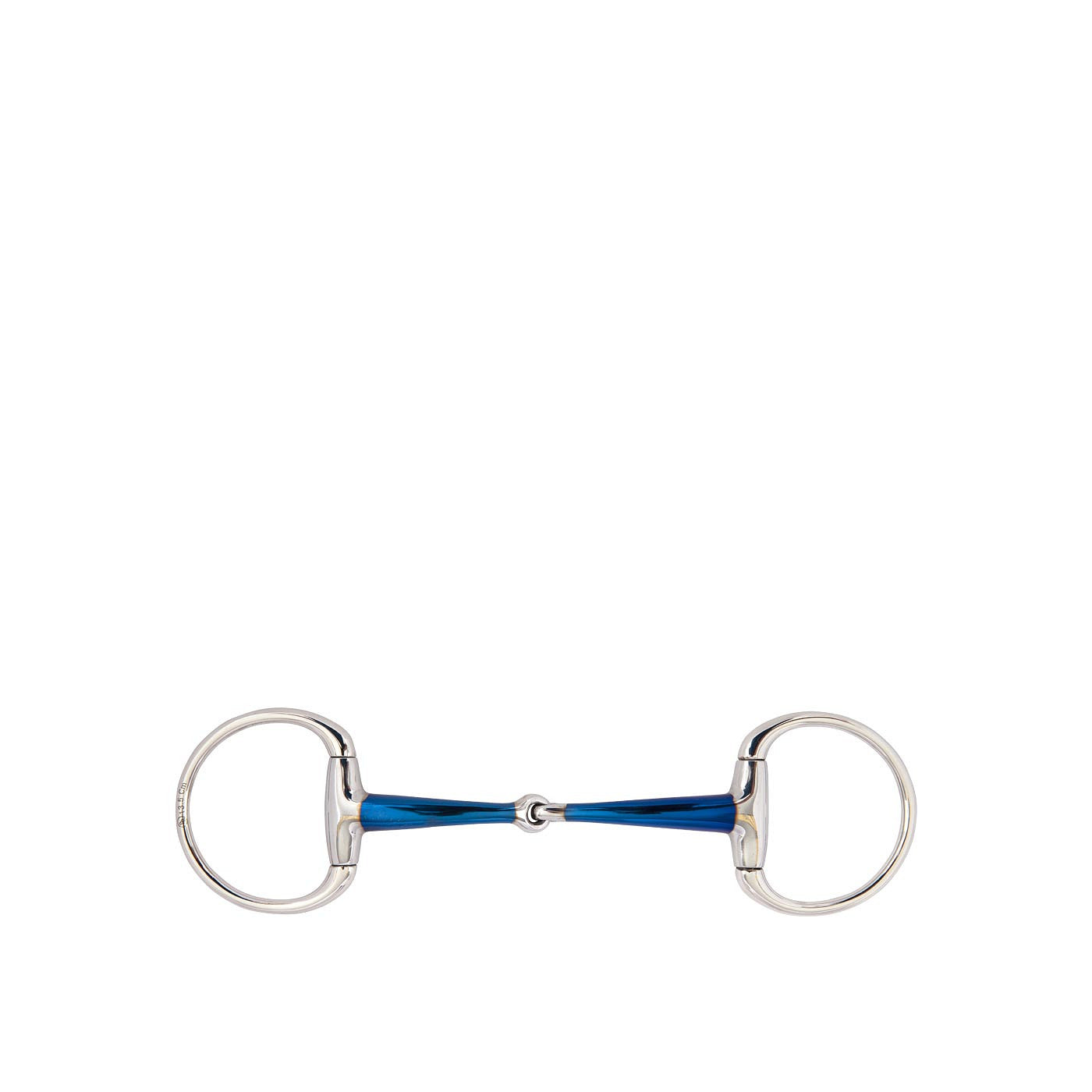 Dieses einfach gebrochene Wassertrensengebiss ist aus massiven Edelstahlringen und einem Mundstück aus Weicheisen gefertigt, kombiniert mit einer Sweet-Iron-Schicht auf dem Mundstück (blau). Die Sweet-Iron-Beschichtung auf dem Mundstück stimuliert die Speichelproduktion. Wenn dieses Material mit Feuchtigkeit, Wärme und Luft reagiert, oxidiert es und entwickelt eine süßlich schmeckende Oberflächenrostschicht. Dies fördert die Akzeptanz des Gebisses. Schließlich verschwindet die blaue Farbe, aber der Geschmack des Oberflächenrostes bleibt erhalten.