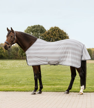 Eine klassische Fliegendecke, die effektiv vor lästigen Insekten schützt. Sie verfügt über abnehmbare, verstellbare Sattelgurte, die eine präzise Passform ermöglichen. Sie verfügt außerdem über eine Schweiflatz, einen tiefen Schenkelgurt und einen Klettverschluss unter einem praktischen T-Steg.