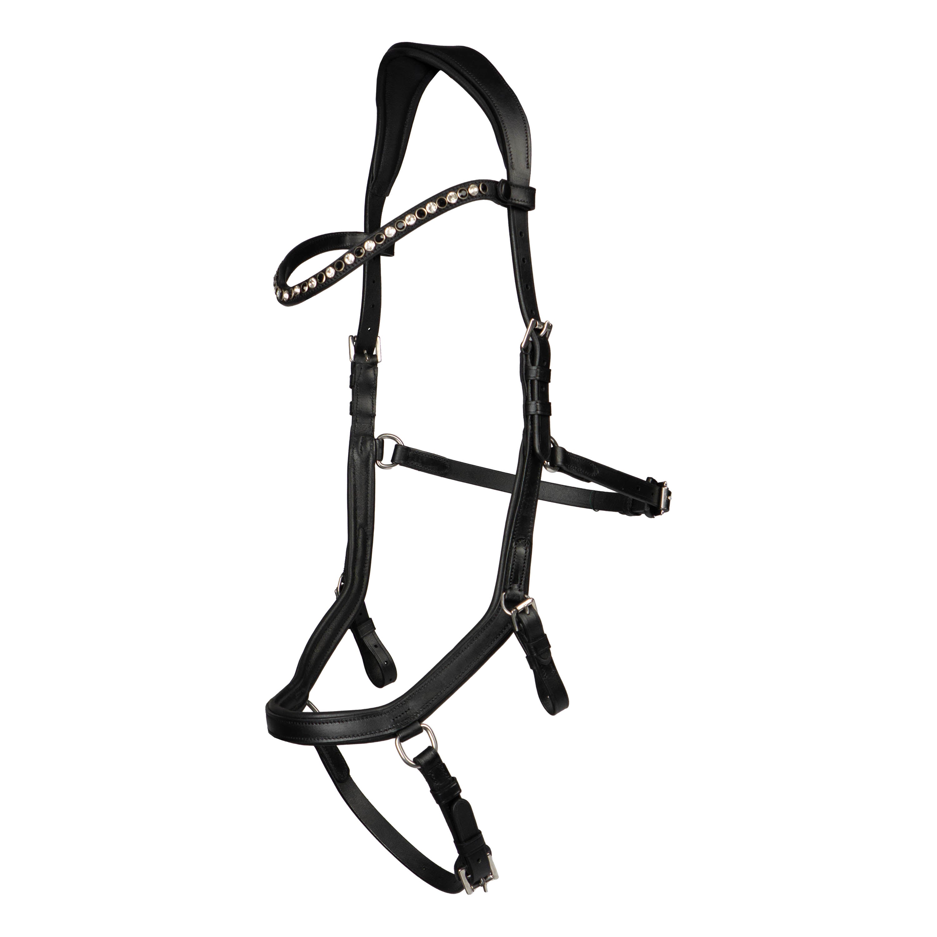 Das Nox-Zaumzeug ist anatomisch geformt, um Druck auf empfindliche Stellen zu vermeiden. Inklusive Lederzügel und Gebissriemen zur Anpassung des Gebisses an die richtige Höhe. Das Stirnband ist mit schwarzen und weißen Strasssteinen besetzt und lässt sich dank eines Druckknopfs leicht abnehmen. Produktspezifikationen: Inklusive Lederzügel Inklusive Gebissriemen in zwei Größen Nasenriemen mit weißer Unterlage Anatomisch geformtes Stirnband mit schwarzen und weißen Steinen Leicht abnehmbares Stirnband mit Druckknopf Material: 100 % Leder