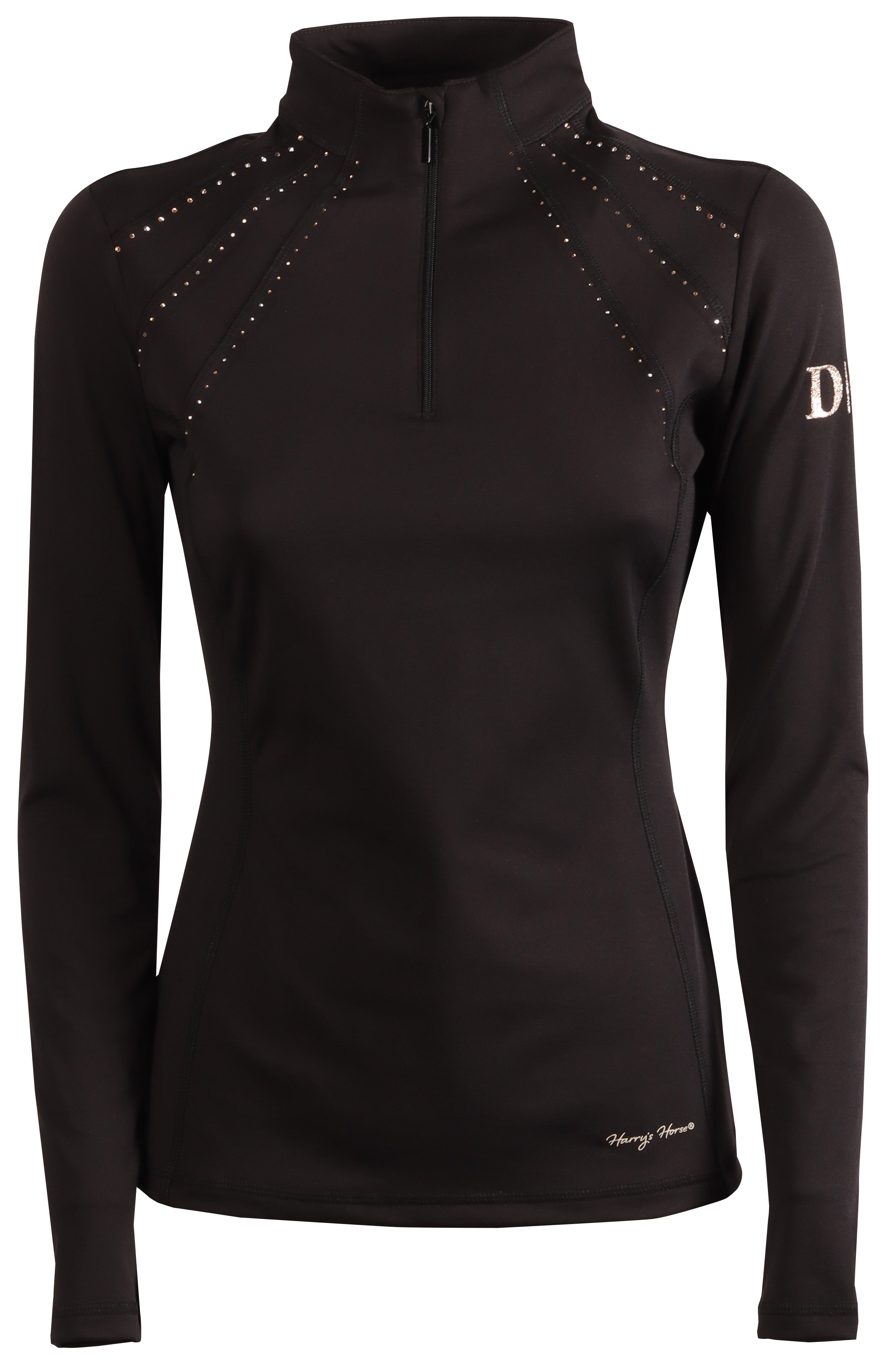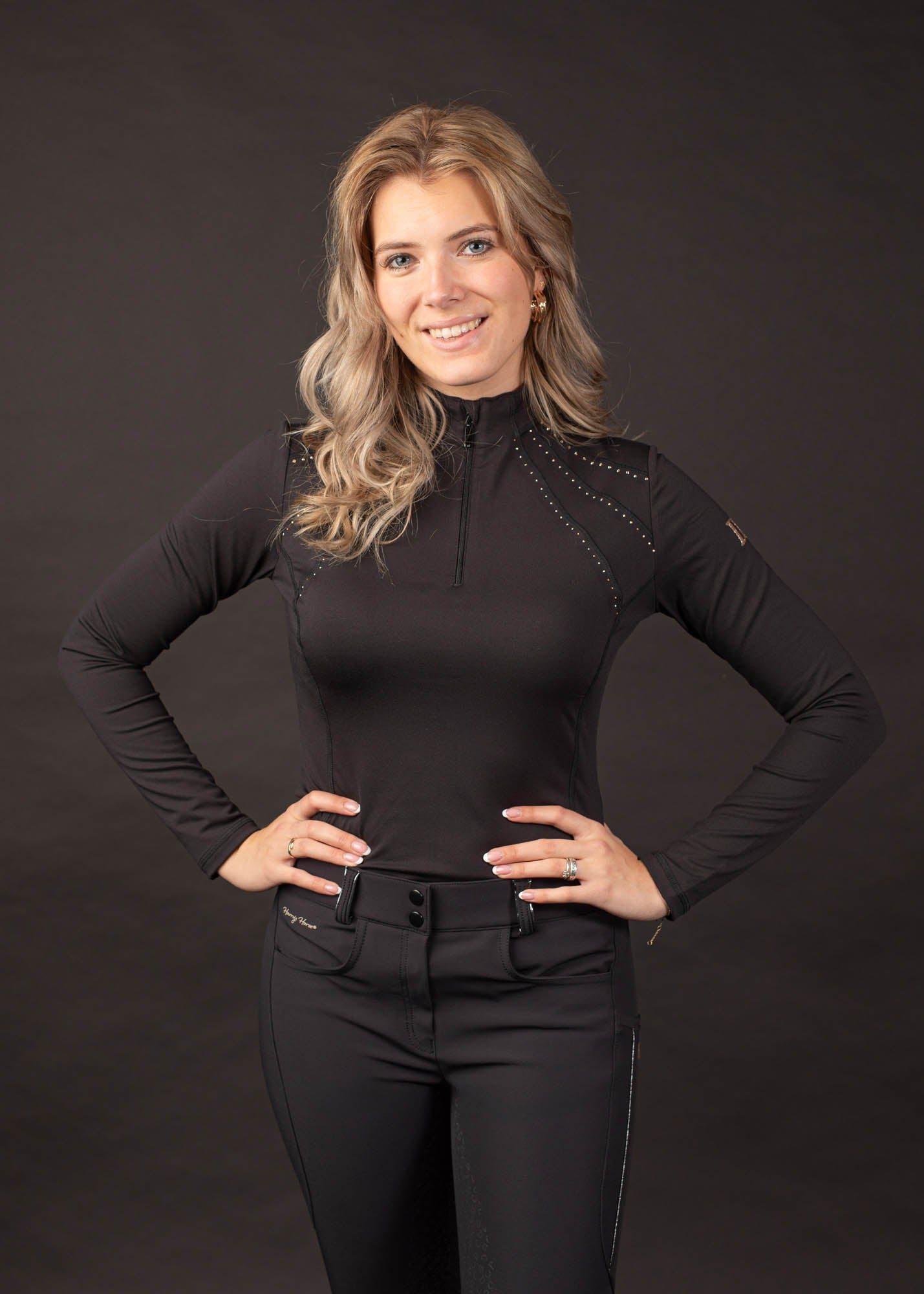 Shirt met lange mouw, opstaande kraag met korte rits. Aan de bovenkant aan de voorzijde van het shirt zijn naast de sierstiksels rijen met kristallen in verschillende formaten geplaatst en het Denici Cavalli logo op de linkermouw.